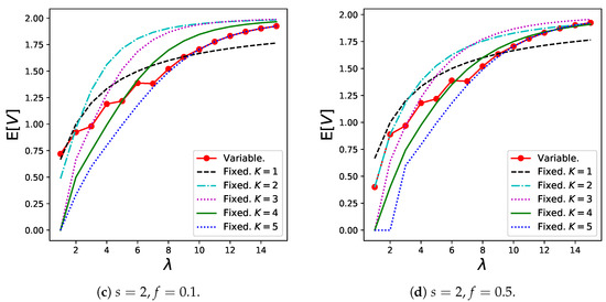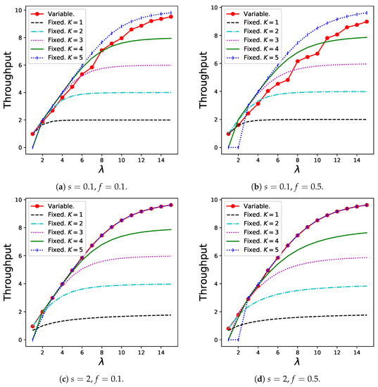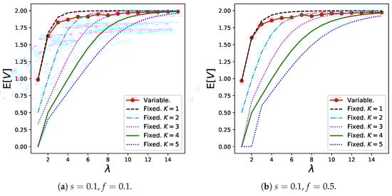 The reason for the poor performance of the variable batch service model when s is relatively low (Figure 6a,b) can be explained as follows: Customers tend to create small batches because the sharing fee that can be saved by creating a larger batch is less compared to the long expected waiting time in this case. This trend is presented in Table 1. However, if a considerably large number of small batches are generated, the congestion in the queue becomes serious, resulting in the balking of many customers. Therefore, a relatively large K (for example, ) is more desirable in these graphs from the throughput viewpoint.