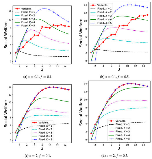 Figure 7 shows the results for social welfare, , in Theorem 6. The variable batch service model exhibited the best performance when s as well as are relatively high. When , the variable batch service model shows stable performance for any , whereas the regular batch service model with small batch sizes always shows poor performance, and the regular batch service model with large batch sizes shows poor results within the low zone. Therefore, the variable batch service model can be considered robust against demand fluctuations when s is large.