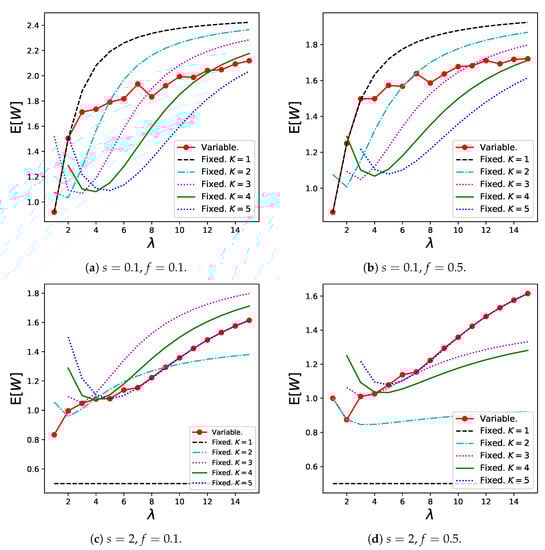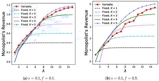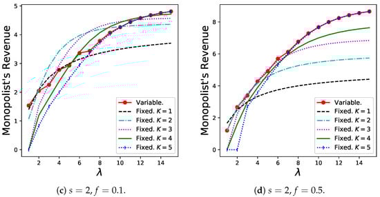 The results for the monopolist’s revenue, , are shown in Figure 8. The variable batch service model exhibits good performance as long as both s and f are relatively high (as in Figure 8d). However, especially when f is extremely small, the revenue of the variable batch service model decreases slightly.