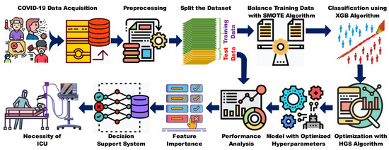 During a pandemic, the effective management of limited critical care resources and ICU beds is crucial [8]. Concerns have been raised worldwide regarding the scarcity of intensive care unit (ICU) beds for COVID-19 patients, particularly in developing countries. For instance, in Bangladesh, only 1200 ICU beds are available (including in public and private hospitals), indicating a significant shortage of critical healthcare resources. Nevertheless, prioritizing COVID-19 patients for specialized care with emergency medical support, particularly in an ICU, can significantly reduce fatality rates. Hence, frontline healthcare workers are forced to care for the “sickest of the sick” patients because of the immense pressure on the ICU admission queue. Owing to limited medical and human resources, healthcare professionals may rely on cutting-edge technologies and machine learning (ML) models to monitor and assess high-risk patients.