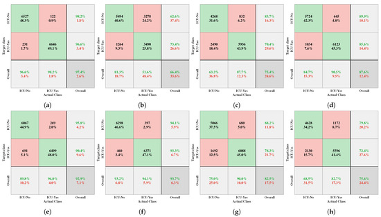 Confusion matrices generated for the (a) HGSOXGB, (b) GNB, (c) LDA, (d) KNN, (e) RF, (f) LGBM, (g) GBC, and (h) LR methods. Note that in each confusion matrix, rows correspond to the target classes, columns denote the actual classes, diagonal cells highlight correct classifications, and off-diagonal cells indicate errors. Each cell displays both a count and percentage value. The rightmost column of the confusion matrix presents precision and false discovery rate metrics, providing insight into the accuracy of the predictions for each class. Furthermore, the bottom row of each matrix reflects the recall and false negative rates, indicating the accuracy for actual class instances. Ultimately, the bottom-right cell of each matrix encapsulates the overall accuracy of the model.