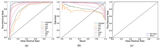 The (a) ROC, (b) precision–recall, and (c) bootstrap ROC curves for HGSOXGB.