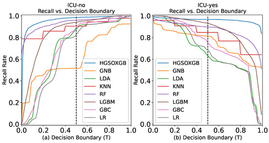 Recall rate vs. decision boundary for (a) ICU-no class and (b) ICU-yes class.
