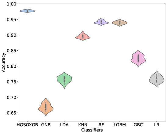 This study includes the violin plot presented in Figure 5, which illustrates the cross-validation accuracy of the various models. The plot clearly shows that the proposed HGSOXGB outperforms the other models in terms of cross-validation accuracy. The white dots represent the median value, the thick gray bars in the center denote the interquartile range, and the upper and lower thin gray lines indicate the values 1.5 times the interquartile range. A wider section of the violin plot indicates a higher likelihood, whereas narrower sections indicate a lower probability. Furthermore, the analysis of variance (ANOVA) test indicated that the HGSOXGB results are statistically significant ().