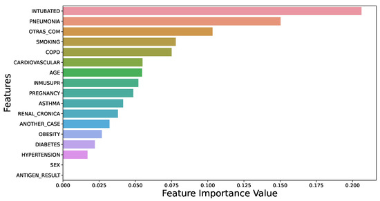 The dominant features that significantly affect the necessity for ICU care for COVID-19 patients were categorized using XGB. The feature importance plot of this study in Figure 6 reveals that “intubated” is the most important feature in predicting ICU requirement, followed by “pneumonia”. Note that features such as “otras_com”, “smoking”, “COPD”, and “asthma” substantially influence the prediction for ICU requirement for COVID-19 patients [13,31].