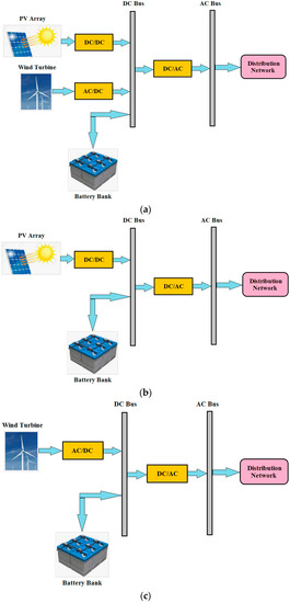 Configurations of the energy system: (a) HPV/WT/Batt, (b) PV/Batt, and (c) WT/Batt.