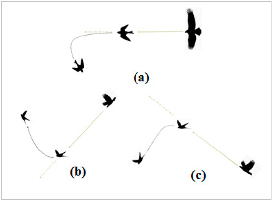 Escape maneuvers of the prey bird from the predator: (a) turn maneuver, (b) vertical maneuver and upward movement of the prey bird, and (c) vertical maneuver and diving movement of the prey bird [26].