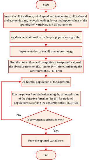 A new optimization algorithm, named the improved escaping-bird search algorithm (IEBSA), is applied to solve the scheduling of different configurations of the HS in distribution networks and, following its formulation, is presented.