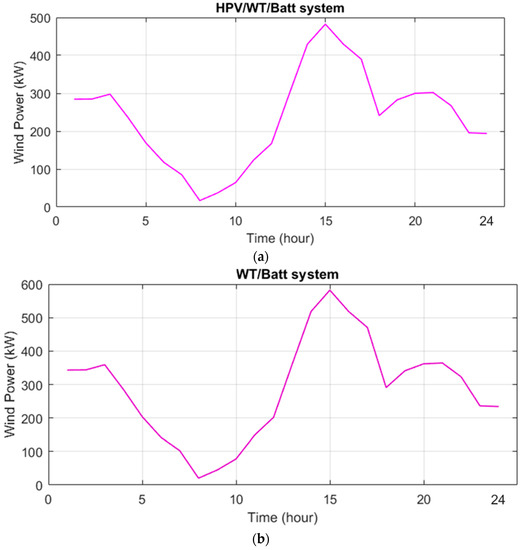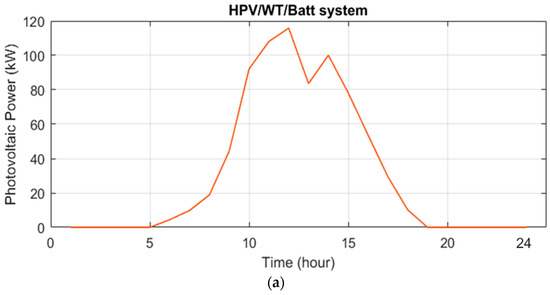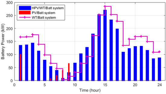 The studied HS included a photovoltaic system, wind turbines, and batteries. The batteries were used to compensate for the power fluctuations of renewable sources and create electrical scheduling and, thus, improve load reliability. The DC/DC converter was applied to boost the PV supply voltage, the AC/DC rectifier to convert wind power to DC power, and the DC/AC converter to convert DC power to AC power and transfer it to the distribution network. In Figure 1, different configurations of the HSs, including HPV/WT/Batt, PV/Batt, and WT/Batt, are shown.