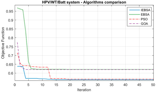 - The comparison of the IEBSA results with the conventional EBSA, PSO, and GOA algorithms show its superiority in overcoming the premature convergence based on the escape operator from the local optimal and achieving lower values for different objectives. Also, the superior performance of the proposed methodology-based IEBSA was proved when compared to the previous study of ref. [33].