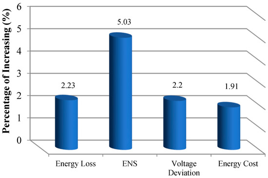 - The results showed that the HPV/WT/Batt configuration obtained better objectives than the other combinations such as the lowest values of energy losses, voltage deviations, HS costs, and also the highest reliability levels compared to the other system configurations. The energy losses reduced from 1436.17 kWh to 960.88 kWh, ENS declined from 9.41 MWh to 4.37 MWh, voltage deviations decreased from 0.7602 p.u to 0.2811 p.u and the HS cost obtained was USD 1,455,800. Also, the results showed that the PV/Batt was the weakest configuration in achieving different objectives improvement, especially in hours of network peak load.