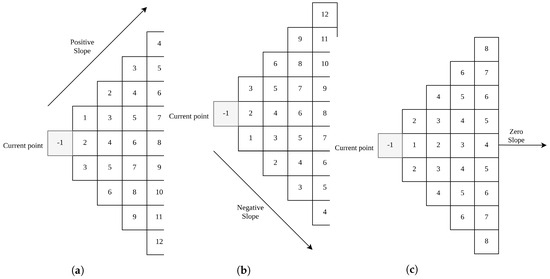 Order of evaluation using the contour algorithm. Positive slope () in (a). Negative slope () in (b). Zero slope () in (c).