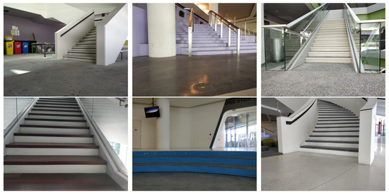 To gather the images in the working environment for the training phase, an RGB camera, with a resolution of pixels, was fitted on top of a sTetro robot [7], as shown in Figure 4. It was taken into consideration that the images were taken from different staircases at different angles, e.g., approximately from 0 to 180 degrees in front of stairs. It was also considered that images were taken from different distances (approximately 2–10 m) and different positions to generalize the training dataset. Some images were captured with a hand-held camera at the height of the sTetro robot. Most of the images were captured in the Singapore Univerity of Technology and Design (SUTD), e.g., in Figure 3, Figure 4, Figure 5, Figure 6 and Figure 7, while some images were taken from residential and shopping malls in the city center to ensure diversity in the dataset. The dataset consists of eleven different types, shapes, and materials (metal, wood, and plastic) of staircases, with a total of 206 images, which include both straight and curved staircases. The whole dataset was split in a ratio of 90:10 into training and testing datasets, respectively. Some of the sample images present in the dataset are shown in Figure 5.