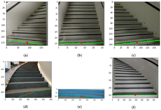The results are shown in Figure 8. Here, the first step of the staircase detected using contour detection is denoted by the line. The cross represents the computed target point, . The detected angle of approach, , is also shown below each figure. The algorithm is able to detect these with good accuracy, as shown in Figure 8a–c,e,f. Figure 8d is the image of a textured staircase, where the approach is not very consistent due to the noise generated during Canny edge detection.