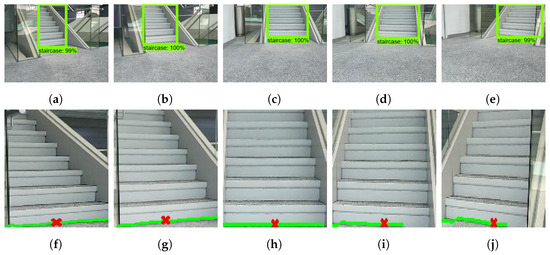 Real-time staircase detection. (a–e) Staircase detection results. (f) The first step detected in (a) (instruction: move right). (g) The first step detected in (b) (instruction: move right). (h) The first step detected in (c) (instruction: move straight). (i) The first step detected in (d) (instruction: move left). (j) The first step detected in (e) (instruction: move left).