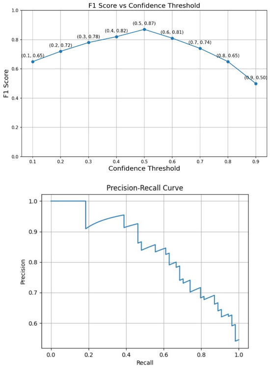 Model performance measure curves: (top) F1 score curve versus confidence threshold variation, (bottom) precision versus recall curve.