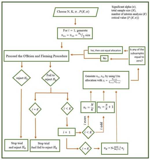 In any stage, if , the null hypothesis is rejected, and the experiment is terminated. Otherwise, if the critical value does not exceed the subsequent subjects are randomized, their measurements are observed, and the steps are repeated. After completing tests, if does not exceed the study is terminated by concluding that the hypothesis of no difference cannot be rejected at the (α) significance level.