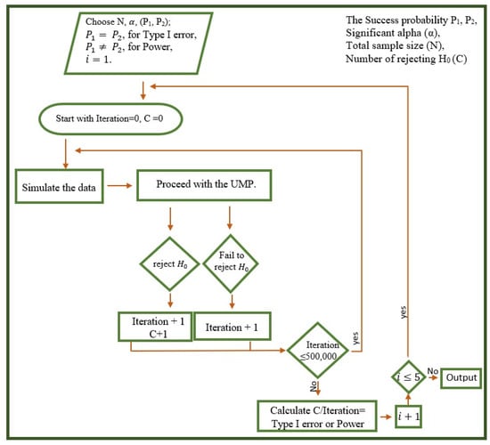 For , the sample sizes were 1380, 396, 200, and 120, while for , the sizes were 2040, 600, 300, and 180, to ensure a significant difference. Two subsamples were generated for each case of from different binomial distributions with different means. The new procedure was utilized to test whether the null hypothesis ( indicating that there is no difference between the two groups, could be rejected in favor of the alternative hypothesis ( The entire process was repeated 500,000 times to calculate the proportion of rejections of representing the power rate, given that was guaranteed to be true. The graphical representation of the power computation process can be found in Figure 2.