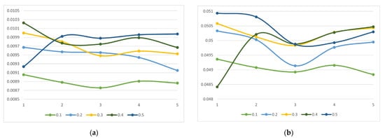 The results for sample sizes 360 and 300 are presented in Table 2, with significance levels of 0.05 and 0.01, respectively. In the first case, where the sample size was 360, and the coefficient of determination was 0.05, we observed that the type I error ranges from 0.04907 to 0.050808 when . For , the type I error values range from 0.048838 to 0.05047, which are very close to the significance level of 0.05. This improvement in error control over the usual Chi-square procedure is considered acceptable.