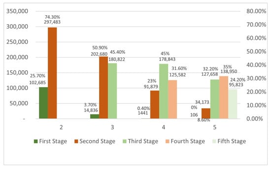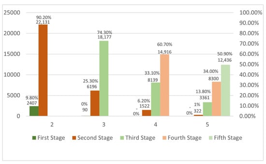 - For the first stage, with and the subsamples distributed equally with . Then, the Chi-Square statistic was 8.6, and after dividing the Chi-Square value by one-fifth, the value was 1.72, which is not greater than the critical value, so we failed to reject the hypotheses.
