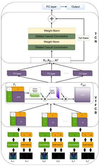 In our proposed RFCT model, the visual feature extraction module and the tactile feature extraction module , the IDTP method + CBAM (VTFCB) module, and the TCN network are implemented by neural networks with different structures and parameters. The steps are illustrated in Figure 5, where we describe the three modules. Below are the specific details of our network model implementation.