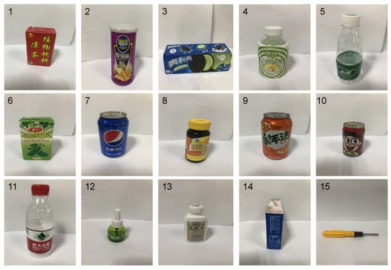 Our experiments were conducted using the UR5 robotic arm and Robotiq shown in Figure 3 to grasp the state evaluation targets. The maximum opening distance of the end-effector was 85 mm, which was reduced to 75 mm due to the two Uskin tactile sensors affixed inside. The two tactile sensors gathered 2 × 4 × 4 × 3 = 96 signals, and the camera was mounted to the side of the end-effector, the angle of which could be adjusted while capturing 224 × 224 × 3 RGB image signals. The 15 weak-stiffness targets are shown in Figure 7, for which the grasping states were divided into the five types discussed.
