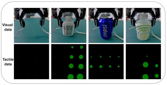 To address this need, we add the detection of a target’s deformation degree based on slip detection, including “no contact”, “moderate contact”, and “excessive contact” states. This variety of gripping states allows robots to adapt their gripping and slip controls more intelligently. We mimic humans’ neurologically driven tactile strategies to propose a new deep-learning visual–tactile fusion with deformation. We use normal red–green–blue (RGB) cameras as visual sensors and an array of Uskin tactile sensors, each with 16 points, providing three-axis (x, y, and z) information [13] for acquiring the corresponding sequence readings (Figure 3) in two lateral shear directions (x, y) on the target. The z-axis reflects the contact strength. This results in the extraction of more effective visual–tactile fusion features. In this report, we provide experimental results on the efficacy of visual and tactile information extracted using different feature fusion methods. An ablation study is also applied to understand incremental performance improvements based on model constituents.
