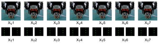 The visual input for each of the following experiments was the raw data of size 224 × 224 × 3. The tactile signal input was data of size 4 × 4 × 3 that changed after contact to evaluate different models. The visual–tactile seven-frame input is shown in Figure 9.