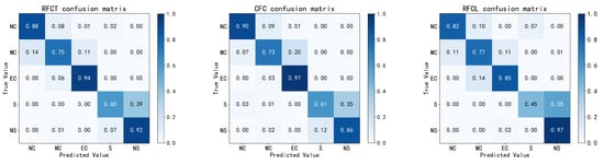 Confusion matrix for RFCT, CFC and RFCL models. NC stands for “no contact”, MC stands for “moderate contact”, EC stands for “excessive contact” states, S stands for “slip”, and NS stands for “no slip”.