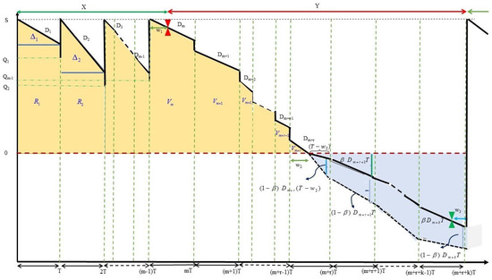 Here, the amount of lost sales for the epoch is expressed as the length . For the epoch, the lost sales are represented by the segment , which is the sum of the length and . Therefore, . Likewise, the present study measures the amount of lost sales in any cycles (see Equation (26)).