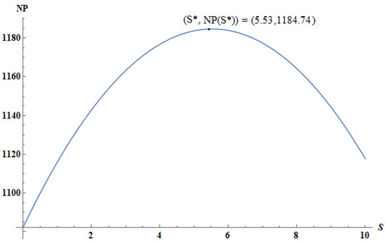 By substituting the value of the parameters of Table 3 into Equation (35), we transform the long-run net profit with respect to variable S, and it is expressed as