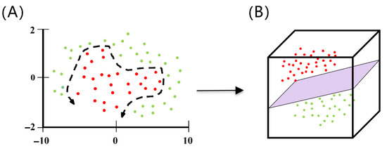 The mapping from low-dimensional spaces to high-dimensional spaces: (A) low-dimensional space; (B) high-dimensional space.