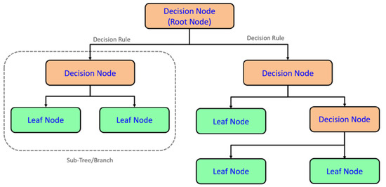 The structure of DT, which can be used conduct classification and prediction operations, is composed of nodes and directed edges, as seen in Figure 3 [64]. There are three main strengths of DT: (1) its principle is easily understood; (2) the number of needed specimen data points for modeling is not many; and (3) the performance of DT is convenient to validate with static tests [65].