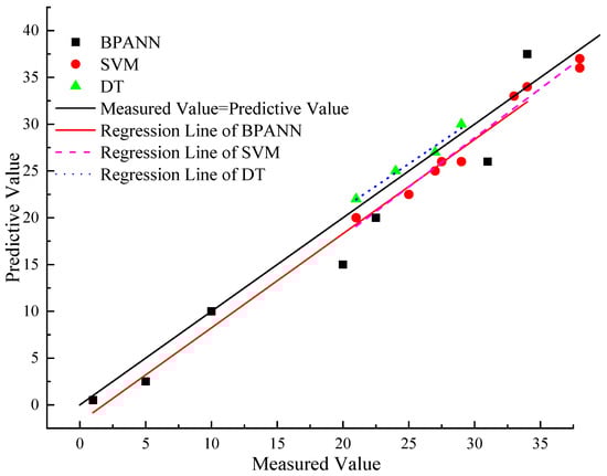 As above, in Figure 5, the black straight line (y = x) indicates that the observed value equals the predicted value. In general, the data points obtained by BPANN are closer to the line. To analyze and compare the forecasting precision of the three machine learning algorithms, the data points in Figure 2 were fitted by using Equation (1) to obtain the regression coefficients, as listed in Table 4.