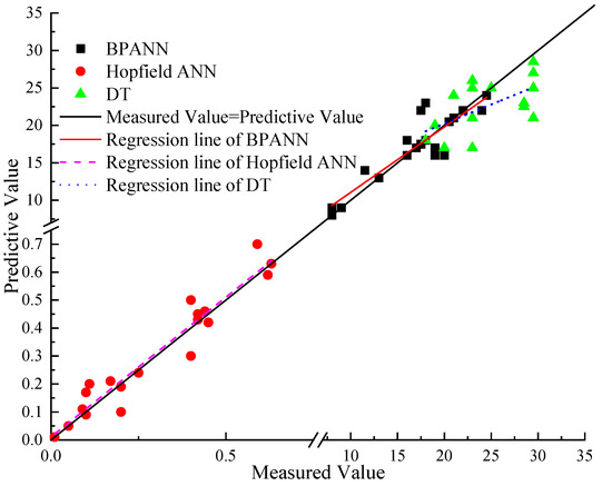 According to Table 4, the regression coefficients of the three machine learning algorithms are all above 0.90. Among them, the regression coefficient of BPANN is the highest, at 0.99. Thus, based on the collective research, compared to Hopfield ANN and DT, it is recommended to adopt BPANN to assess the compressive strength of rock.