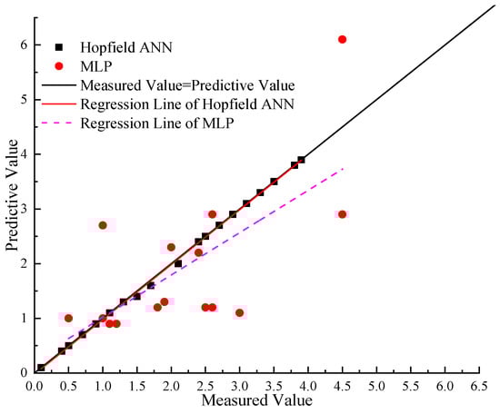 As above, in Figure 6, the black straight line (y = x) indicates that observations equal predictions. In general, the data points obtained by Hopfield ANN are closer to the black line. To conduct quantitative analysis and draw comparisons on the prediction precision for the two machine learning methods, Equation (1) is used to fit the data points in Figure 6; the regression coefficients are listed in Table 6.