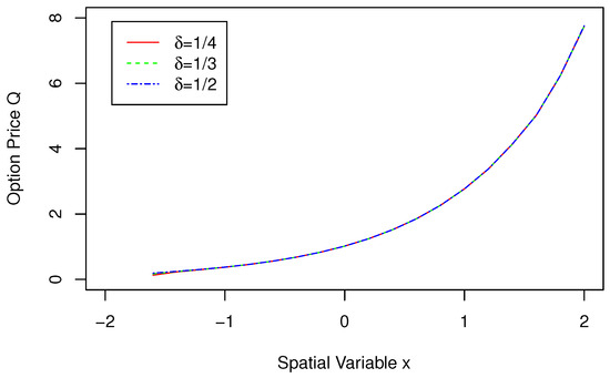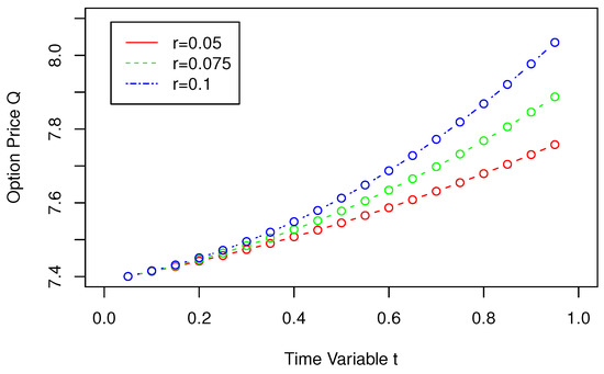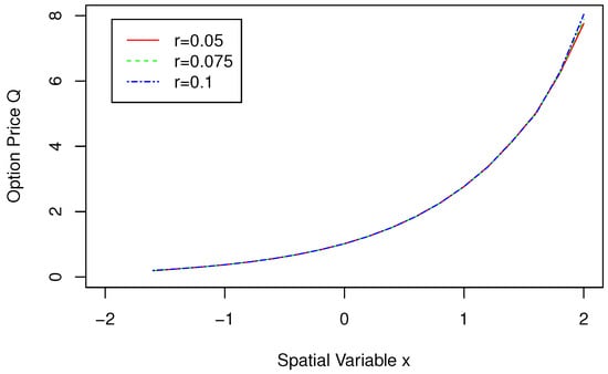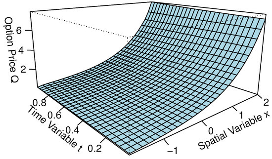 Figure 1 shows the change trend of Spatial Variable x and Option Price Q for when . When takes different values, it is noted that the changes in option prices are basically consistent, indicating that the obtained pricing model is feasible. Figure 2 shows the change trend of Spatial Variable x and Option Price Q for when . When the value of x approaches 2, the option price gradually increases as r increases, and the change trend of Spatial Variable x and Option Price Q is roughly the same in the rest of the time. Figure 3 shows the change trend of Spatial Variable x and Option Price Q for when . When the value of x is less than , the option price gradually increases as increases, and the change trend of Spatial Variable x and Option Price Q is roughly the same in the rest of the time. Overall, the option price gradually increases with the increase of spatial variable x, and the rate of growth also gradually increases. Figure 4 shows the change trend of Time Variable t and Option Price Q for when . The option price gradually increases as the time variable t increases. As can be seen from the figure, as r increases, the slope of the line gradually steepens, and the option price increases more quickly. When and , the surface plot of the approximate solution for is given in Figure 5.
