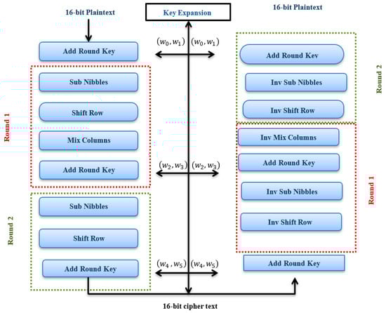 This section introduces the fundamentals of the S-AES algorithm [2,43] with its related information, the S-AES encryption, key expansion, and decryption technologies. S-AES is a block cipher that accepts a 16-bit plaintext and a 16-bit key as input and outputs of a 16-bit ciphertext. A state is created from the 16-bit input plaintext, which is a 4 × 4 matrix of nibbles (a nibble is a 4-bit block). A state is taken and replaced with another one for the next round; this process occurs in each round. Substitution (Sub. Nibbles), mix columns, shift row, and round key addition represent four S-AES transformations. The S-AES encryption, decryption and key generation, and decryption techniques are described in Figure 1.