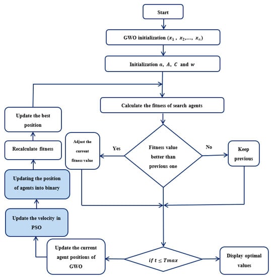 Then, the velocity of the PSO is integrated with the solutions obtained by the GWO variant to perform the following updating procedures (see Equation (19)).