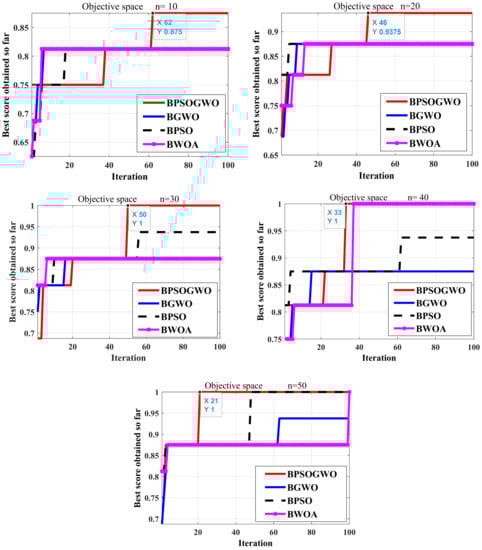 The investigation is performed using different sizes of population (10, 20, 30, 40, and 50) and 100 iterations. Figure 3 shows the outcomes of the experiments with two noteworthy observations: (a) For all algorithms BPSOGWO, BGWO, BPSO, and BWOA, with increasing population size, the average fitness of optimal solutions rises, and the proposed BPSOGWO is superior. Also, it was noticed that the proposed BPSOGWO achieves the optimal results with the population size of 30 agents, and (b) the optimum solutions obtained with BPSOGWO in different population sizes are significantly higher than those obtained from other algorithms. Accordingly, the population size is adopted as 30 agents and 100 iterations. By applying the proposed algorithms, it can be noted that the BPSOGWO provides faster convergence than the others, saving the computation efforts as it reaches 30 search agents only with 49 iterations. Furthermore, the statistical results during the different runs for the proposed BPSOGWO and the compared ones are presented in Table 2. Based on reported results, the proposed BPSOGWO provides competitive results in terms of best value, while the BPSOGWO achieves superior results in terms of mean values. Moreover, the BPSOGWO saves more computational time than the other optimizers.