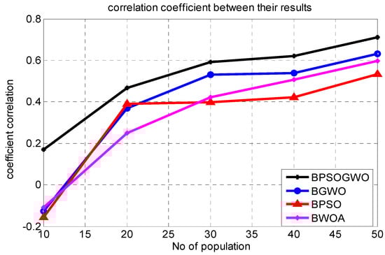 It can be seen from the graph that BPSOGWO performs better than other algorithms and has the best correlation between our results. We utilized 50 keys as a sample to construct this coefficient, calculating the fitness of each and the number of correct bits where x and y are n elements arrays.