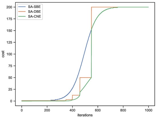 - The SA-SBE curve shows a smooth but marked increase in cost as the optimization progresses due to the exponential cooling schedule used. It indicates that SA-SBE is significantly more computationally efficient at higher temperatures, i.e., when smaller sample sizes can be used. As the optimization approaches the end, the evaluation cost becomes similar to that of SA due to the larger sample sizes required.