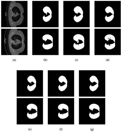 Lung segmentation examples: (a) input slices, (b) outputs of , (c) outputs of , (d) outputs of , (e) ensemble outputs, (f) post-processed ensemble outputs, (g) ground truth.