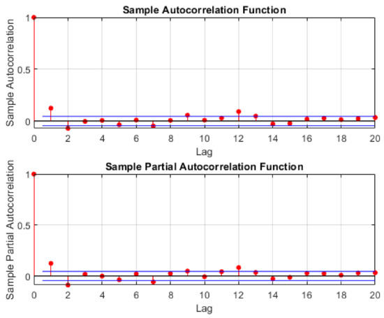 The model is chosen according to the Box–Jenkins methodology [37] based on the values of autocorrelation (ACF) and partial autocorrelation (PCF) functions. Graphs of the corresponding functions for the difference in index values are shown in Figure 4. Analysis of these graphs shows a probable ARMA(1,1) model or, taking into account the previously calculated difference from the original values, we obtain the ARIMA(1,1,1) model.