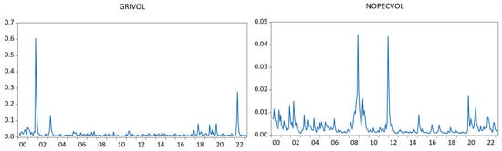 These periods mark the occurrence of major events such as the 2008–2009 global financial crisis, the aftermath of the 2011 Libyan war, and the global COVID-19 pandemic. It is worth noting that the volatility in the return index does not show significant or obvious spikes in 2022 to reflect the 2022–2023 Russian–Ukrainian conflict. This observation corroborates the assertions made by [45,48], who argue that the impacts of geopolitical events can vary across oil-producing and oil-exporting nations. Furthermore, these periods may present potential opportunities for positive spillover effects, as a decline in oil supply could lead to price increases or production shortfalls that might be compensated for by other oil-producing regions. In contrast, the volatility series of geopolitical events index captures this event as being the second most significant after the 9/11 terrorist strike and the Iraq invasion (Figure 3).