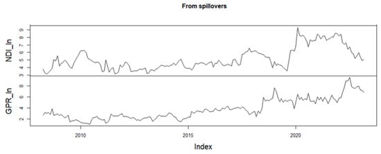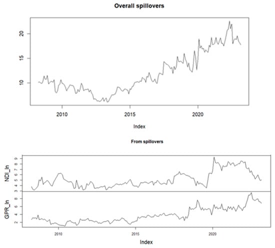 Based on the obtained results, the overall spillover is estimated to be approximately 4.5%, indicating a notable level of connectedness. However, the NOPEC variable cannot affect the NDI or GPR variables, which results in their lowest values in the spillover table. Therefore, we focus on the NOPEC column in the table instead.
