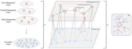 Multi-layer networks use layers to highlight the differences in nodes and connections between different levels. A coupling network refers to a network composed of nodes at different levels generating shared connections to achieve coupling. Since coupling networks are suitable for describing the internal operating mechanisms of complex systems, there has been much research on the mechanisms and characteristics of coupling networks in recent years. Murata [28] conducted an in-depth study of the coupling mechanism of coupling networks, proposed a generalization method for inter-layer coupling in multi-layer networks, and tried to use it to detect communities in multi-layer networks. The literature [29] studies the impact of inter-layer coupling on the centrality measurement of multi-layer networks, and discusses the effects of two popular inter-layer coupling methods: diagonal coupling and diagonal coupling with cross-coupling between adjacent layers. The literature [30] studies the synchronization of multi-layer fully coupled networks and their simplest equivalent networks, and discusses the important factors affecting synchronization. In terms of application, it is often used to explore issues such as information dissemination and material dissemination, and is used in fields such as public health, transportation, and public opinion monitoring. The specific application research is shown in Table 1. Therefore, due to the coupling network’s better explanation and restoration of the information propagation mechanism and its similarity to the tree structure of the project group organization, this article decided to use the coupling network to model and describe the project group organization plan.