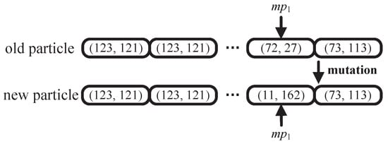 where . means a randomly selected encoding position on particle k for random mutation. Figure 2 shows the mutation operator in the inertial part. In this example, the encoding position is selected, and replaces to get the new particle.