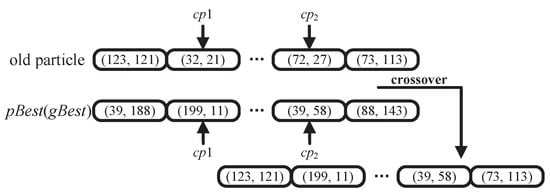 respectively, where . The crossover operator randomly picks the encoding fragment between two encoding positions and replaces it with the encoding fragment at the same position in or . Figure 3 illustrates the crossover operator in the individual or social learning part. In this example, the crossover operator picks the encoding fragment between and and replaces it with the encoding fragment at the same position of or . Finally, the new particle is obtained.