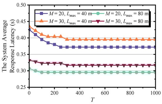 First, we analyze the convergence of the proposed PSO&GS. Figure 4 shows the variation of the system average response latency obtained by PSO&GS with the increase in the number of iterations. As shown in Figure 4, PSO&GS always converges to a stable result within 500 iterations, no matter how M and vary. Specifically, the convergence of PSO&GS is slower when m compared to m. It is because more GDs will be outside the coverage of the UAV when its coverage is small. In such cases, more stringent requirements for UAV deployment are needed to provide computational service to more GDs. Therefore it takes more time for UAV deployment employing PSO&GS. With a large maximum service distance of the UAVs, almost all GDs are within their coverage, so PSO&GS takes less time searching for UAV deployment. Further, the convergence curves of PSO&GS under different conditions show that the increase in the number of GDs will make the problem solution space larger and cause the convergence of PSO&GS to slow down. In summary, the convergence performance of the proposed PSO&GS is excellent in various scenarios.